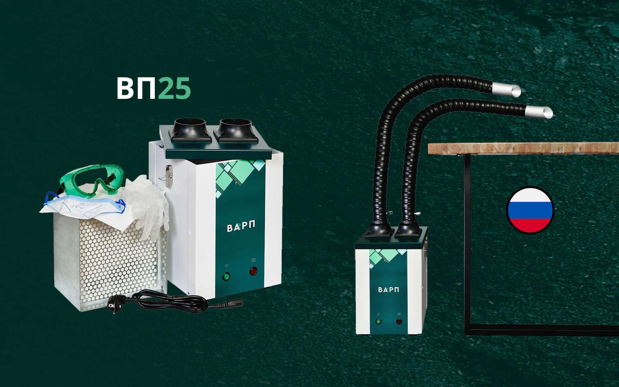 Комплект дымоуловителя ВАРП ВП25 с хим. фильтром, с шарнирным дымоприемником 63мм с крепл. к столу